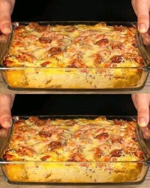 - Repeat the layers: noodles, chicken, ham, Swiss cheese, and sauce, finishing with noodles and a generous layer of white sauce on top.
